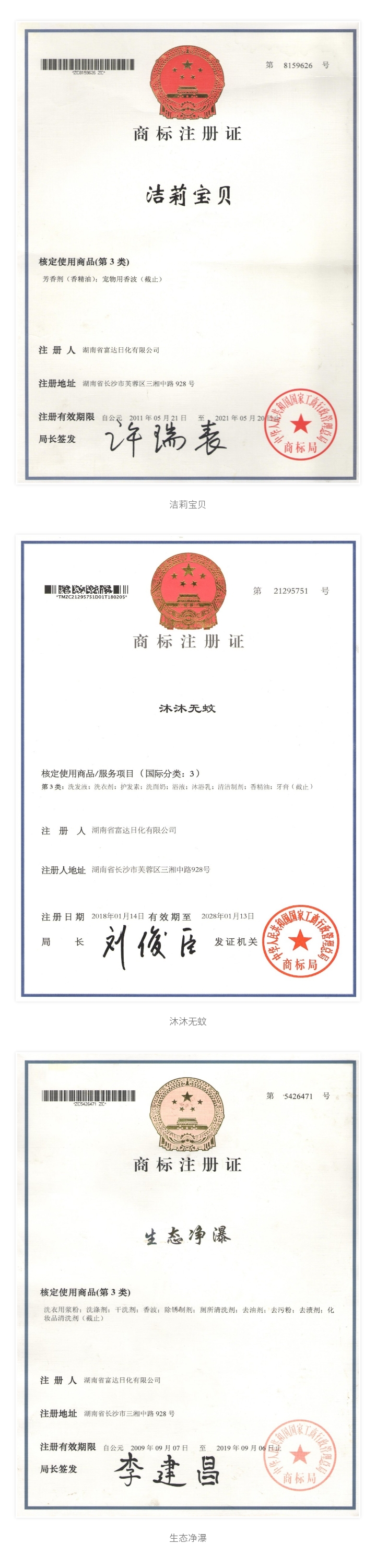 答:富達(dá)日化所有洗滌產(chǎn)品和設(shè)備商標(biāo)均經(jīng)過國家商標(biāo)局正式核準(zhǔn)注冊,可授權(quán)購機用戶免費合法使用。