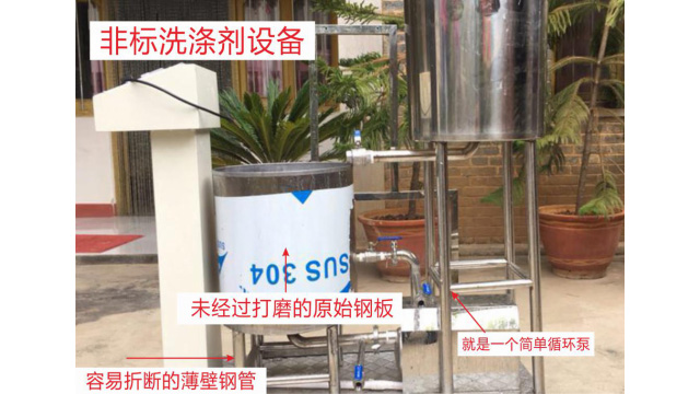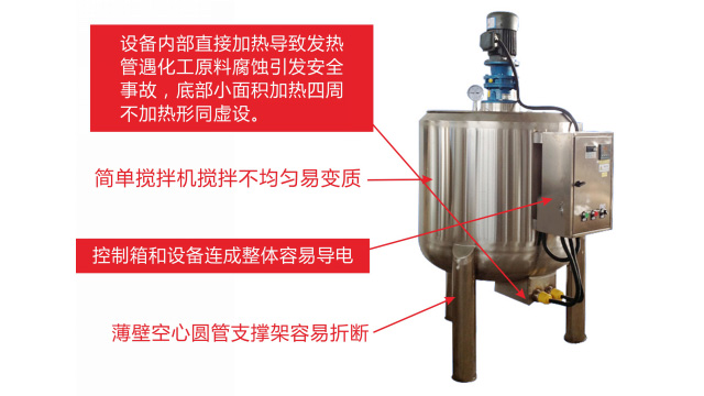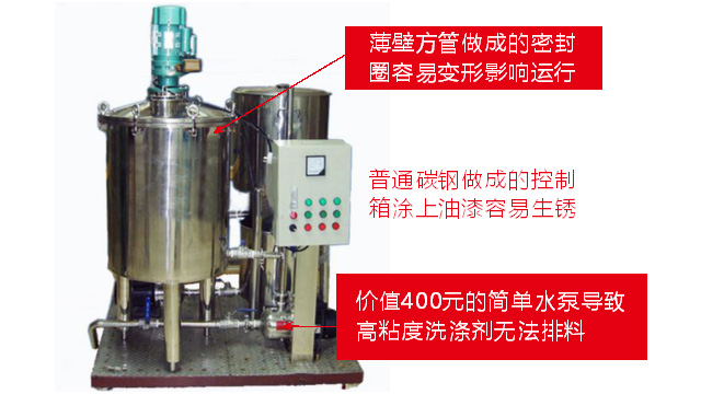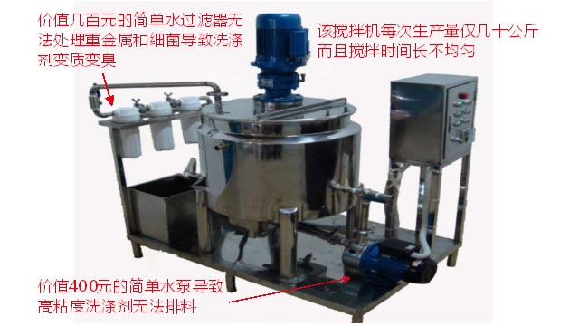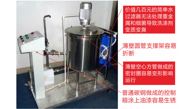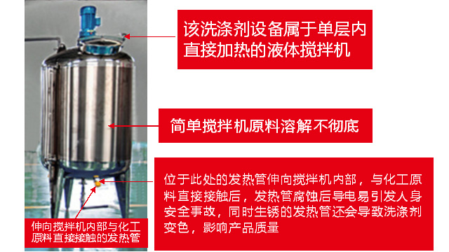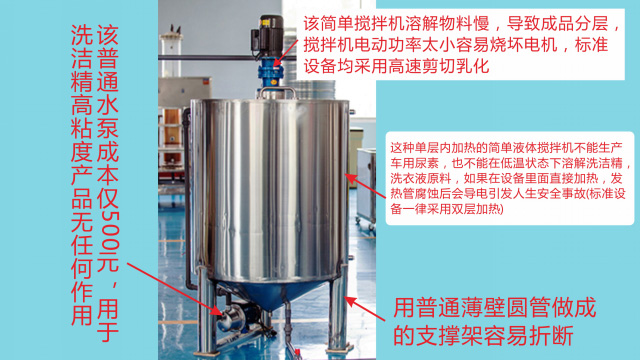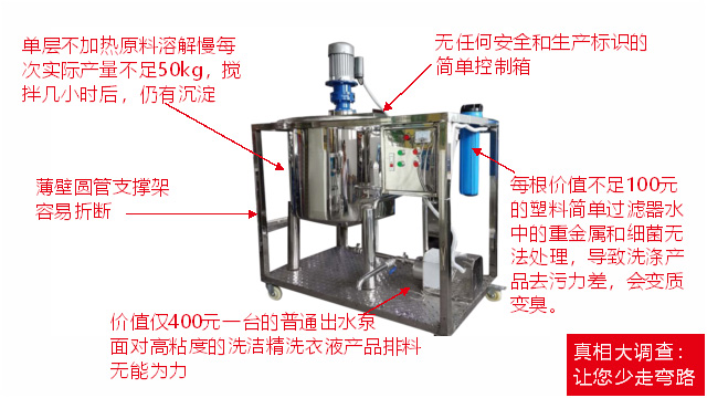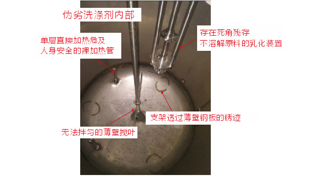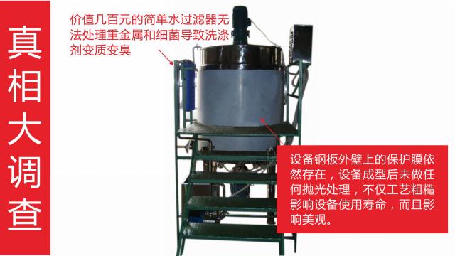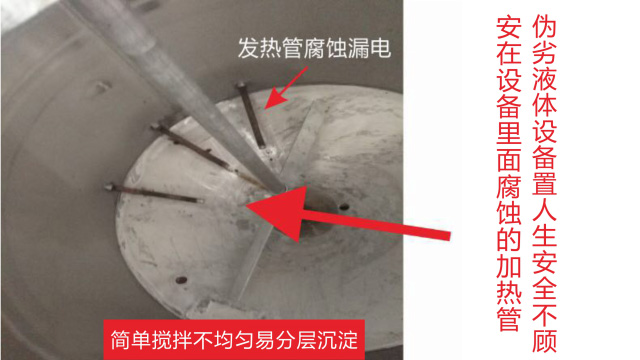 五、項目加盟騙局提供的洗潔精設備、洗衣液設備,大都是單層不加熱或單層攪拌機內部用發(fā)熱管直接加熱,當燒堿、尿素、磺酸等化工原料長期接觸設備內部的發(fā)熱管后就會腐蝕,腐蝕后的的銹斑首先會導致洗滌產品和車用尿素重金屬增加及產品外觀顏色渾濁,還會引起產品中細菌滋生變質變臭,更嚴重的是攪拌機內部的發(fā)熱管腐蝕后導電引發(fā)人身安全危機;