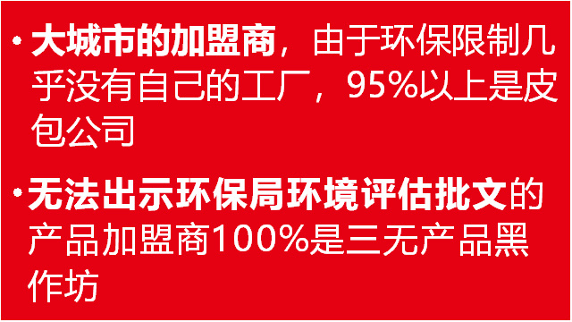 二、加盟騙局實施者雖有營業(yè)執(zhí)照和常規(guī)手續(xù),但沒有環(huán)保局頒發(fā)的的項目環(huán)評報告書,實際上就是一個沒有實體工廠的皮包公司;