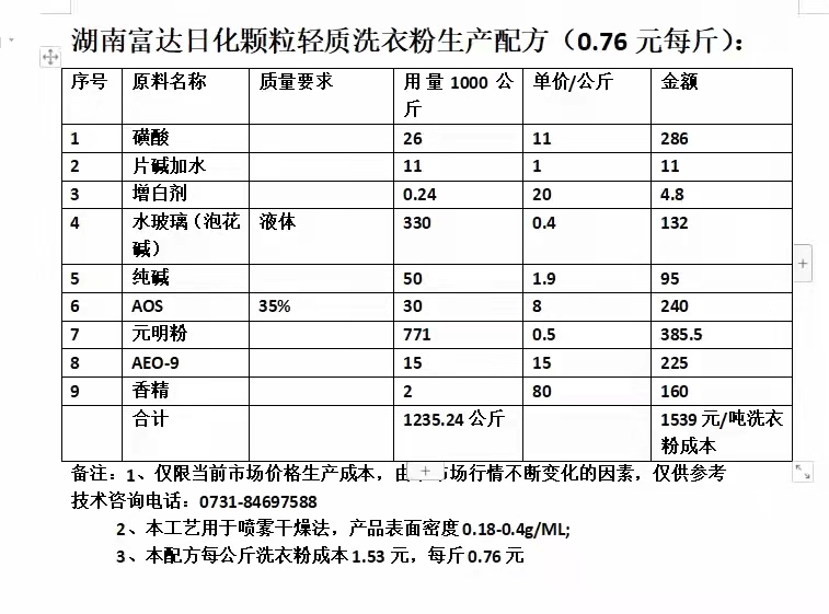 湖南富達(dá)日化洗衣粉技術(shù)配方及其生產(chǎn)成本展示