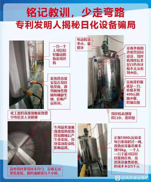 多項(xiàng)專利發(fā)明人王先軍 手機(jī):150-7483-5702 手機(jī):195-7316-0288洗潔精洗衣液車用尿素設(shè)備銷售者五花八門,許多不法商販炮制萬元投資可辦廠的謊言,推銷低價(jià)偽劣洗潔精設(shè)備,洗衣液設(shè)備,車用尿素設(shè)備,無數(shù)初創(chuàng)業(yè)者上當(dāng)受騙血本無歸,為了讓創(chuàng)業(yè)者少走彎路,受良心驅(qū)使,公開揭示日化設(shè)備騙局,以此讓大家少走彎路。