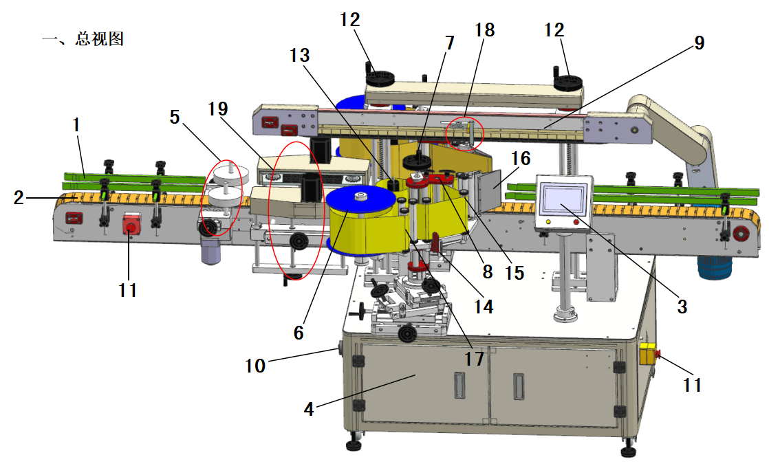 9、壓頂機(jī)構(gòu):用于壓緊瓶子,讓瓶子保持垂直從輸送帶過(guò)來(lái)保證貼標(biāo)精度。
