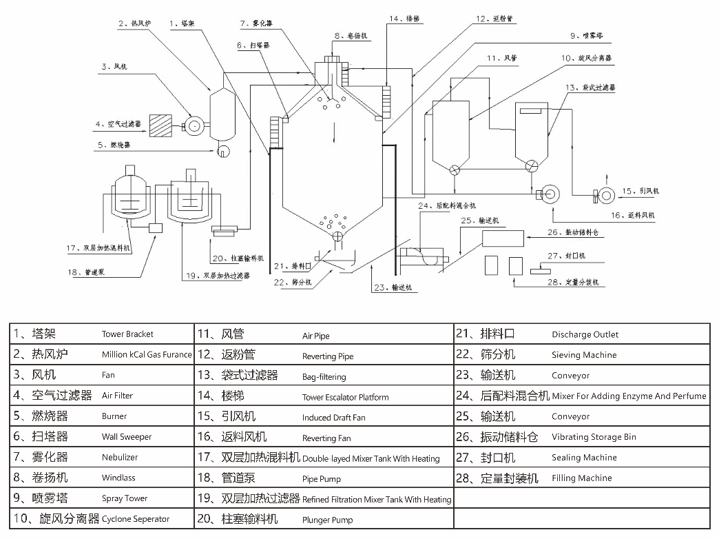備注:噴霧干燥法不同產(chǎn)量的高塔設備高度在24-40米,塔直徑2.5-10米。