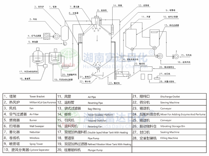 干燥塔(干燥塔體、塔承載加強圈、骨架、熱風分布器、人孔檢修門、出風管及清洗人孔、錐體氣錘、主塔支撐鋼架、進塔熱風管道、變徑連接管道、保溫材料、伴熱攪拌罐、電加熱、過濾器)、熱源系統(tǒng)(燃氣熱風爐)、鼓風機(鼓風機、初/中效空氣過濾器)、進料泵、噴槍、高效旋風分離器(高效旋風分離器、旋風出料閥、緩存料倉)、除塵系統(tǒng)(管道、布袋除塵器)、引風機、控制系統(tǒng)(控制柜、變頻器、溫度傳感器、壓力傳感器)、輔助系統(tǒng)(欄桿、扶梯、現(xiàn)場電線電纜橋架、現(xiàn)場鋼架結構平臺) |
